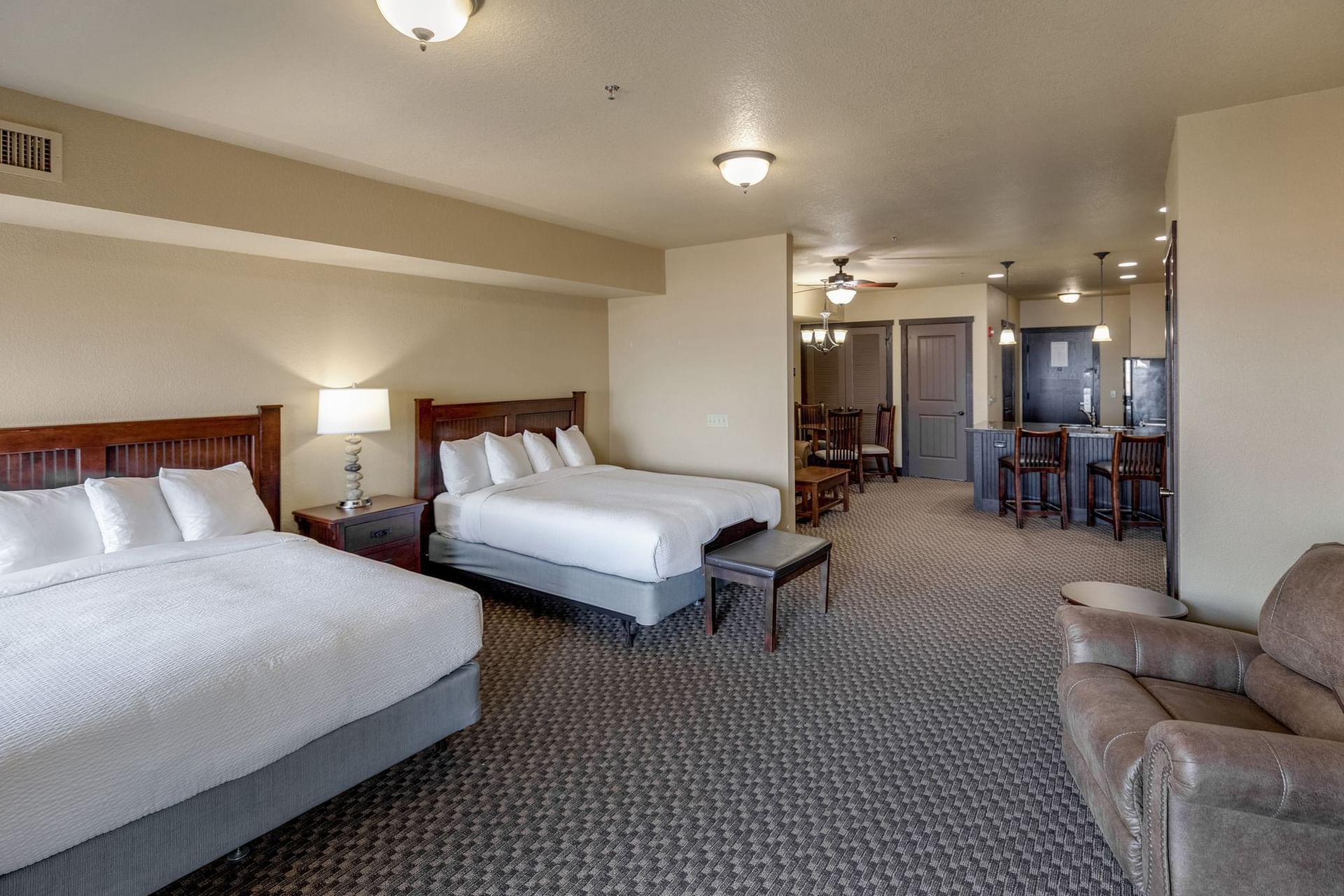 A spacious studio retreat with patio or balcony with views of historic Downtown Walker, two queen beds adorned with our signature bedding, television, washer/dryer, a well-appointed bathroom, and all the amenities needed for the utmost relaxation while indulging in your home away from home.