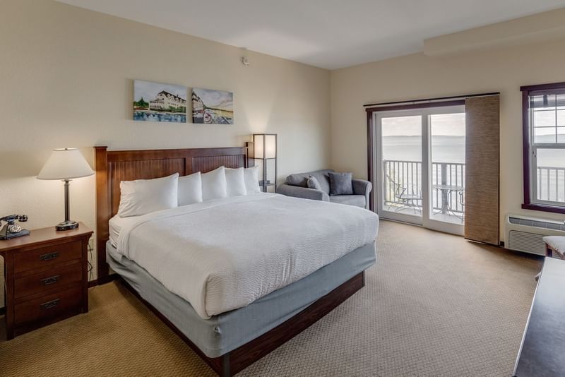 Enjoy beautiful views from your private balcony overlooking the lake. This well-furnished guest room also features a king size bed adorned with our signature bedding and all the amenities needed for unmatched relaxation.